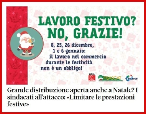 Filcams Cgil Padova, Fisascat Cisl Padova e Rovigo e Uil TuCS Padova: "Basta forzature sulle aperture festive. Il Natale non è un giorno lavorativo ordinario"