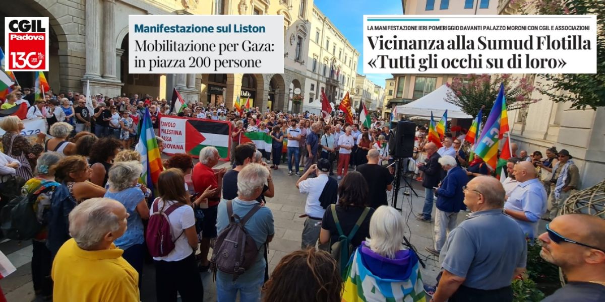 Diverse centinaia di persone, ieri sabato 6 settembre, hanno partecipato nel pomeriggio all'iniziativa organizzata dalla Cgil di Padova, con il sostegno di molte associazioni del territorio, davanti al Comune di Padova per sostenere la Global Sumud Flotilla, una missione umanitaria non violenta che tenta di forzare il blocco navale israeliano per portare aiuti essenziali alla popolazione di Gaza.