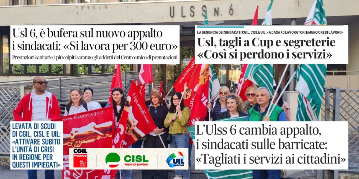 • Cgil Cisl e Uil di Padova lanciano l'allarme: "Da domani, 1° ottobre, con il cambio d'appalto all'Ulss 6 Euganea, sforbiciata di dipendenti e drastico taglio di ore di lavoro per chi resta"