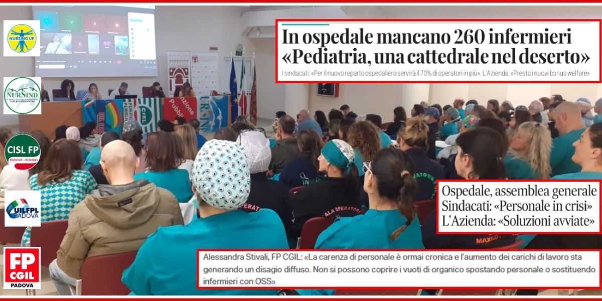 Partecipazione alta e clima di forte preoccupazione all’assemblea sindacale generale del personale del comparto dell’Azienda Ospedale – Università di Padova, convocata ieri, lunedì 20 ottobre, dalla RSU aziendale con la partecipazione di FP CGIL, CISL FP, UIL FPL, NURSIND e Nursing Up.