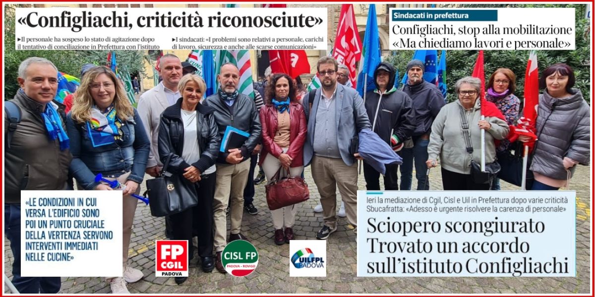 In seguito al tentativo di conciliazione svoltosi oggi a mezzogiorno presso la Prefettura di Padova, i rappresentanti delle Segreterie Provinciali di Fp Cgil, Cisl Fp e Uil Fpl – rispettivamente Alfredo Sbucafratta, Andrea Ricci, e Xena Helena Da Silva Valotti – hanno annunciato la sospensione dello stato di agitazione proclamato nelle scorse settimane, in attesa del prossimo tavolo in Prefettura per la verifica degli impegni presi dalla direzione dell'Istituto Luigi Configliachi. “Stiamo parlando – hanno introdotto Sbucafratta, Ricci e Da Silva Valotti – di una crisi che coinvolge un ente che fa parte della storia della nostra città con 304 posti letto, in maggioranza occupati da persone non autosufficienti, dove lavorano 145 dipendenti pubblici assunti direttamente e un’altra sessantina, attraverso le cooperative. Ricordiamo che solo nel 2022, i dipendenti pubblici erano 215 e già allora c’erano problemi di carenza. E non parliamo di quel che accade oggi: basti solo sapere che, solo da gennaio, ci sono state 15 dimissioni. Abbiamo quindi una carenza di personale che si attesta intorno al 20% e sul fatto che questo sia un problema ci siamo trovati tutti d’accordo”.