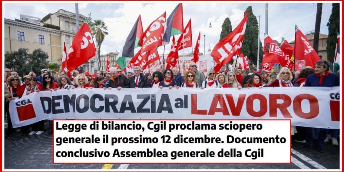 Lo sciopero generale del 12 dicembre ha l’obiettivo fondamentale di aprire una vera e propria vertenza per sostenere le rivendicazioni che abbiamo ribadito anche nel confronto con il Governo, nelle audizioni parlamentari e negli incontri in corso con i gruppo parlamentari sul ddl bilancio: il rinnovo di tutti i contratti nazionali di lavoro per difendere e rafforzare il potere d’acquisto e l’estensione della defiscalizzazione dei relativi aumenti contrattuali a tutte le lavoratrici e lavoratori dei settori pubblici e privati; lo stanziamento di risorse aggiuntive per i rinnovi dei Ccnl pubblici; un piano straordinario di assunzioni e di stabilizzazioni del lavoro precario nei settori pubblici e investimenti per rafforzare il sistema universalistico a partire da sanità, istruzione, enti locali, non autosufficienza, diritto alla casa; la restituzione del fiscal drag e la sua neutralizzazione attraverso l’indicizzazione all’inflazione di scaglioni, detrazioni, trattamento integrativo, Isee ed esenzioni; il blocco dell’aumento automatico dell’età pensionabile per tutte e tutti, una maggior flessibilità in uscita, il riconoscimento del lavoro di cura, il ripristino di “opzione donna” senza penalizzazioni, e una pensione contributiva di garanzia per precari e discontinui; la piena rivalutazione delle pensioni e l’estensione/rafforzamento della quattordicesima; politiche industriali per i settori manifatturieri e per i servizi, al fine di innovare il nostro sistema produttivo, difendere l’occupazione, qualificare la formazione e creare nuovo lavoro stabile e di qualità; la tutela della salute e della sicurezza sul lavoro; il contrasto alla precarietà e al lavoro povero, sommerso, irregolare, nero; investimenti e misure per eliminare i divari di genere occupazioni e salariali e per creare nuova e buona occupazione che metta fine alla fuga di centinaia di migliaia di ragazze e di ragazzi dal nostro paese; una vera strategia per il rilancio del Mezzogiorno.