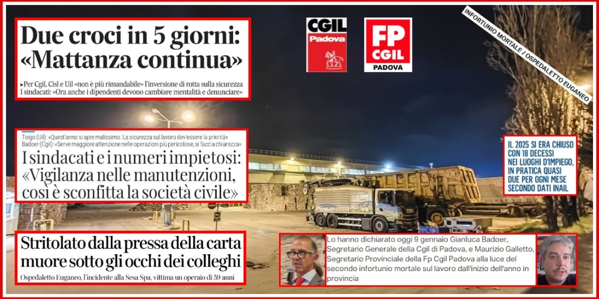 "Siamo profondamente sconvolti per quanto accaduto oggi a un lavoratore di 59 anni, un uomo che ha perso la vita in modo orribile mentre svolgeva il proprio compito – dichiarano congiuntamente Gianluca Badoer, Segretario Generale della Cgil di Padova, e Maurizio Galletto, Segretario Provinciale della Fp Cgil Padova – che si aggiunge all’altro tragico incidente successo solo pochi giorni fa, sempre nella nostra provincia. Due morti sul lavoro in una sola settimana sono una cifra drammatica che non può essere accettata in silenzio. Non possiamo più parlare di incidenti o di fatalità: morire schiacciati in una pressa durante una manutenzione è un fatto di una gravità inaudita che impone di fermarsi e capire cosa non stia funzionando nel sistema della prevenzione e dei controlli."