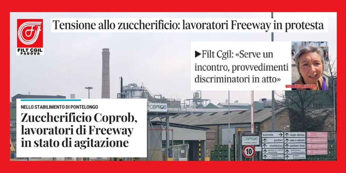 La Filt Cgil di Padova, dopo un’assemblea svoltasi nel pomeriggio dell'altro ieri (martedì, 9 settembre ndr) con i dipendenti, ha dichiarato lo stato di agitazione dei lavoratori della società Freeway srl, che gestisce l'appalto di logistica e movimentazione merci presso lo Zuccherificio di Pontelongo gestito da Co.pro.b (Cooperativa Produttori Bieticoli). Si tratta di 25 persone, 19 assunti con un contratto a tempo indeterminato, il resto a tempo determinato.